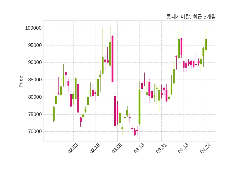 한편, 롯데케미칼은 장 마감 이후 해당 기업공시를 발표했으며 오늘 종가가 96,700원, 거래량은 354,918주로, 직전 거래일 대비 2,600원(+2.76%) 상승했다.