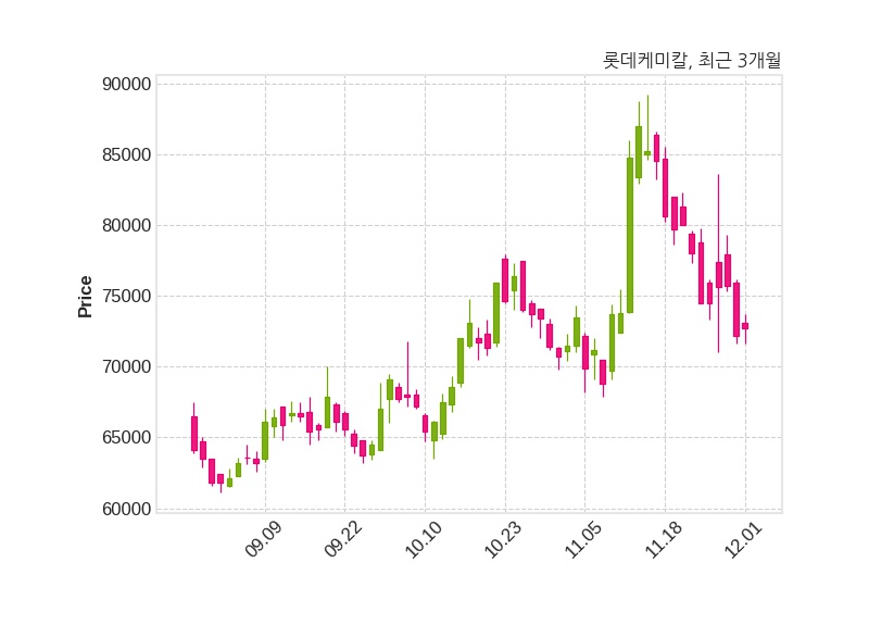 한편, 롯데케미칼은 장 마감 이후 해당 기업공시를 발표했으며 오늘 종가가 72,700원, 거래량은 87,359주로, 직전 거래일 대비 500원(+0.69%) 상승했다.
