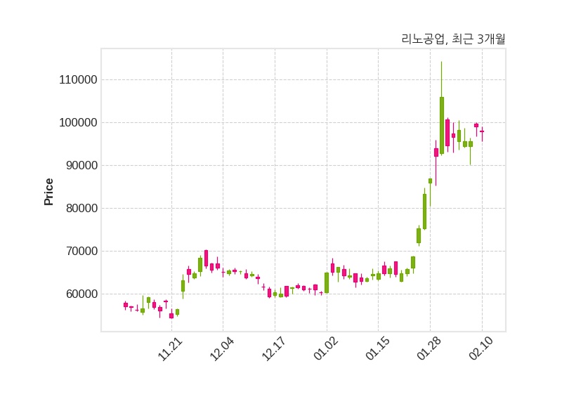 한편, 리노공업의 11시 26분 현재주가는 98,000원으로 직전 거래일 대비 1,000원(-1.01%) 하락이며, 거래량은 283,509주이다.