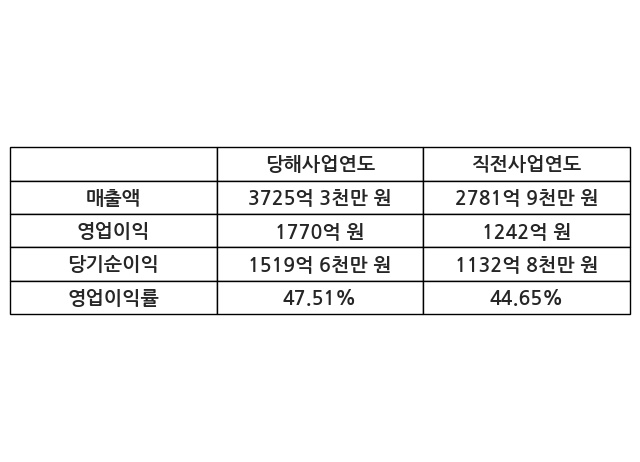 이번사업연도의 매출액은 직전사업연도 대비 33.92% 증가한 3725억 3천만 원, 영업이익은 1770억 원, 당기순이익은 1519억 6천만 원이라고 공시했다.