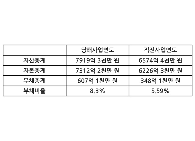또한, 이번사업연도의 자산총계는 7919억 3천만 원으로 직전사업연도 대비 20.46% 증가한 한편, 부채총계는 607억 1천만 원으로 74.38% 증가, 자본총계는 7312억 2천만 원으로 17.44% 증가했다.