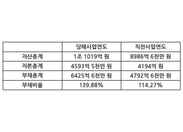 또한, 이번사업연도의 자산총계는 1조 1019억 원으로 직전사업연도 대비 22.62% 증가한 한편, 부채총계는 6425억 6천만 원으로 34.07% 증가, 자본총계는 4593억 5천만 원으로 9.52% 증가했다.