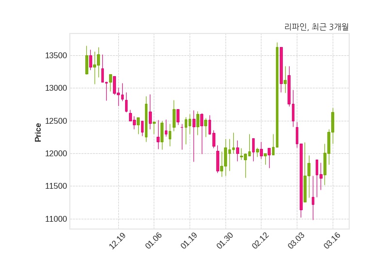 한편, 리파인은 장 마감 이후 해당 기업공시를 발표했으며 오늘 종가가 12,630원, 거래량은 28,200주로, 직전 거래일 대비 300원(+2.43%) 상승했다.