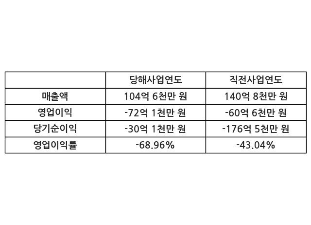 이번사업연도의 매출액은 직전사업연도 대비 -25.74% 감소한 104억 6천만 원, 영업이익은 -72억 1천만 원, 당기순이익은 -30억 1천만 원이라고 공시했다.