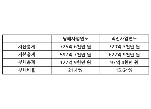 또한, 이번사업연도의 자산총계는 725억 6천만 원으로 직전사업연도 대비 0.74% 증가한 한편, 부채총계는 127억 9천만 원으로 31.31% 증가, 자본총계는 597억 7천만 원으로 -4.05% 감소했다.