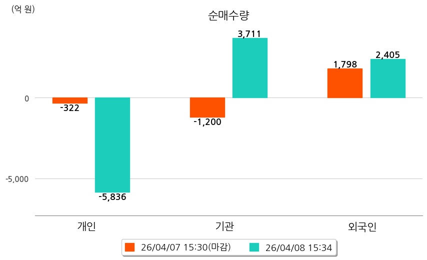 투자자별 동향을 살펴보면 기관은 3,711억 원 순매수했으며, 외국인은 2,405억 원 순매수했다. 개인은 5,836억 원 순매도했다.