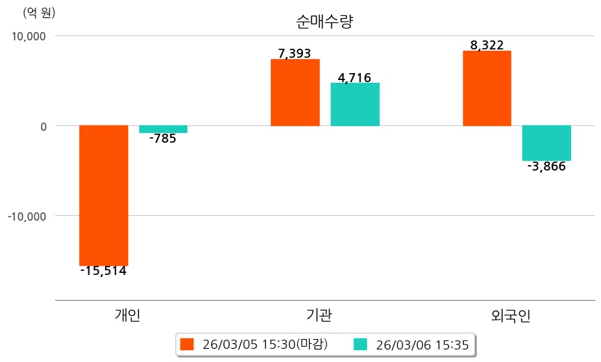 투자자별 동향을 살펴보면 기관은 4,716억 원 순매수했으며, 외국인은 3,866억 원 순매도했다. 개인은 785억 원 순매도했다.