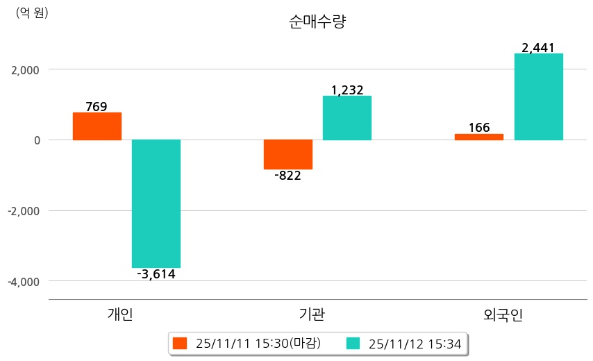 투자자별 동향을 살펴보면 기관은 1,232억 원 순매수했으며, 외국인은 2,441억 원 순매수했다. 개인은 3,614억 원 순매도했다.
