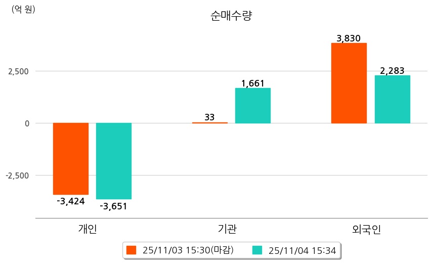 투자자별 동향을 살펴보면 기관은 1,661억 원 순매수했으며, 외국인은 2,283억 원 순매수했다. 개인은 3,651억 원 순매도했다.