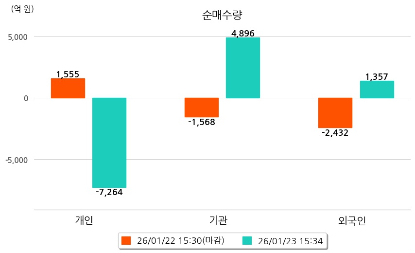 투자자별 동향을 살펴보면 기관은 4,896억 원 순매수했으며, 외국인은 1,357억 원 순매수했다. 개인은 7,264억 원 순매도했다.