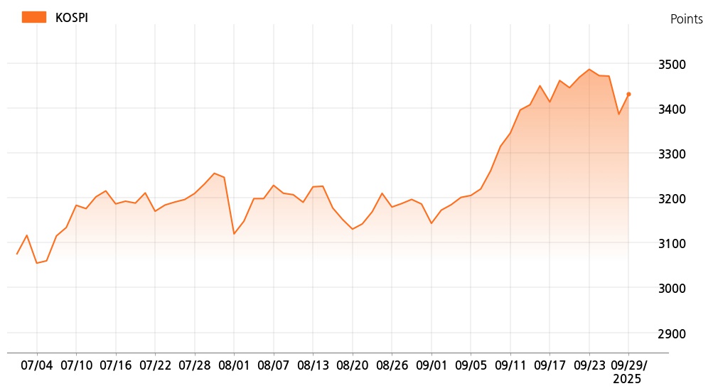 29일 오후 3시 코스피(3,431.21p, 45.16p, +1.33%)는 외국인 매수가 늘면서 상승세를 보이고 있다.