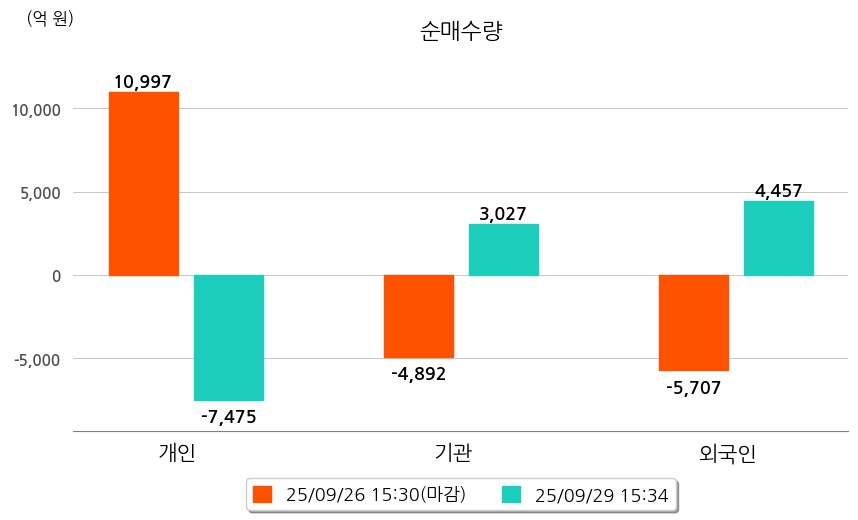 투자자별 동향을 살펴보면 기관은 3,027억 원 순매수했으며, 외국인은 4,457억 원 순매수했다. 개인은 7,475억 원 순매도했다.