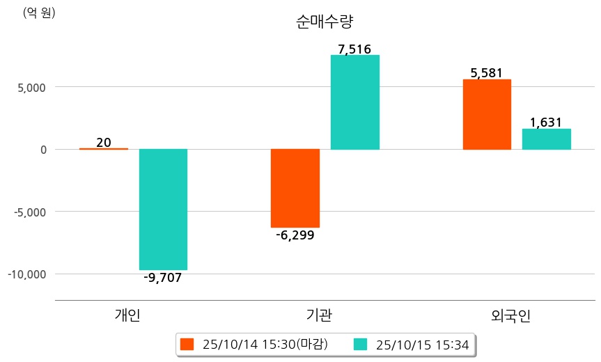 투자자별 동향을 살펴보면 기관은 7,516억 원 순매수했으며, 외국인은 1,631억 원 순매수했다. 개인은 9,707억 원 순매도했다.
