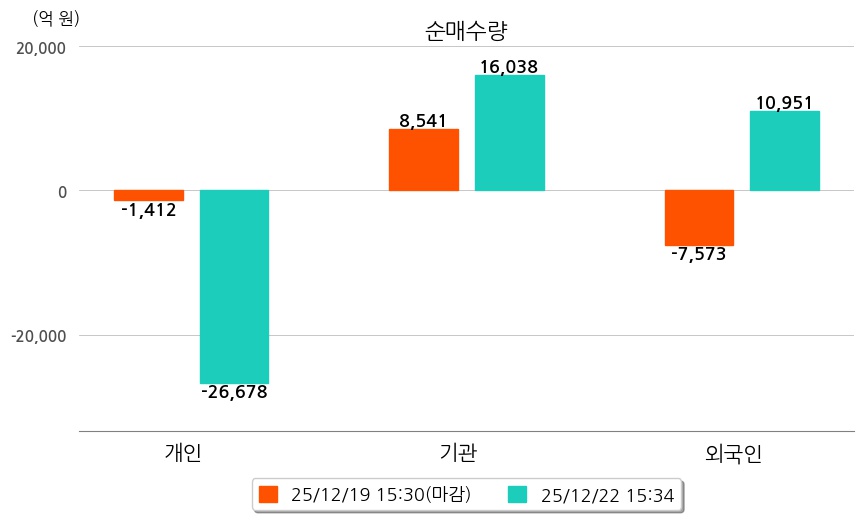 투자자별 동향을 살펴보면 기관은 16,038억 원 순매수했으며, 외국인은 10,951억 원 순매수했다. 개인은 26,678억 원 순매도했다.