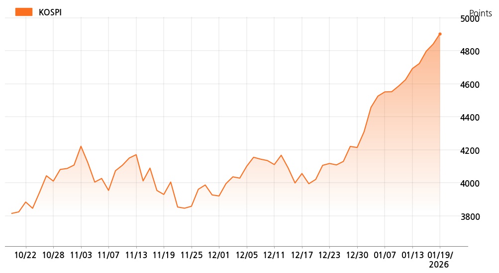 19일 오후 3시 코스피(4,904.66p, 63.92p, +1.32%)는 외국인 매수가 늘면서 상승세를 보이고 있다.