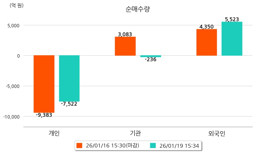 투자자별 동향을 살펴보면 기관은 236억 원 순매도했으며, 외국인은 5,523억 원 순매수했다. 개인은 7,522억 원 순매도했다.