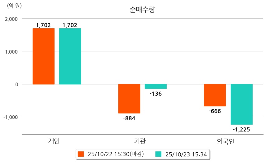 투자자별 동향을 살펴보면 기관은 136억 원 순매도했으며, 외국인은 1,225억 원 순매도했다. 개인은 1,702억 원 순매수했다.