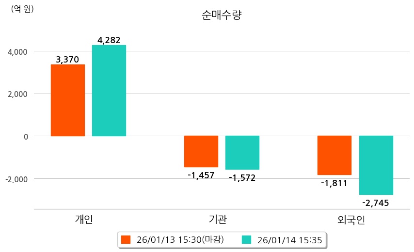 투자자별 동향을 살펴보면 기관은 1,572억 원 순매도했으며, 외국인은 2,745억 원 순매도했다. 개인은 4,282억 원 순매수했다.