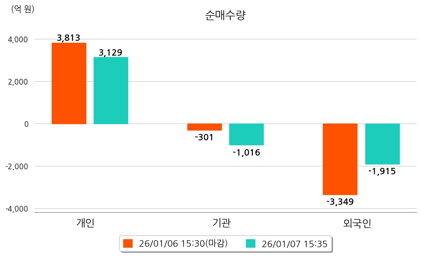투자자별 동향을 살펴보면 기관은 1,016억 원 순매도했으며, 외국인은 1,915억 원 순매도했다. 개인은 3,129억 원 순매수했다.