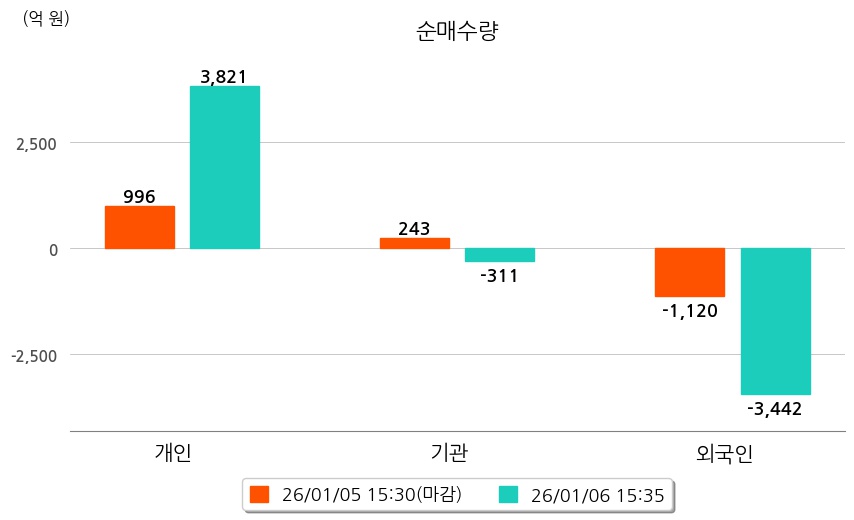 투자자별 동향을 살펴보면 기관은 311억 원 순매도했으며, 외국인은 3,442억 원 순매도했다. 개인은 3,821억 원 순매수했다.