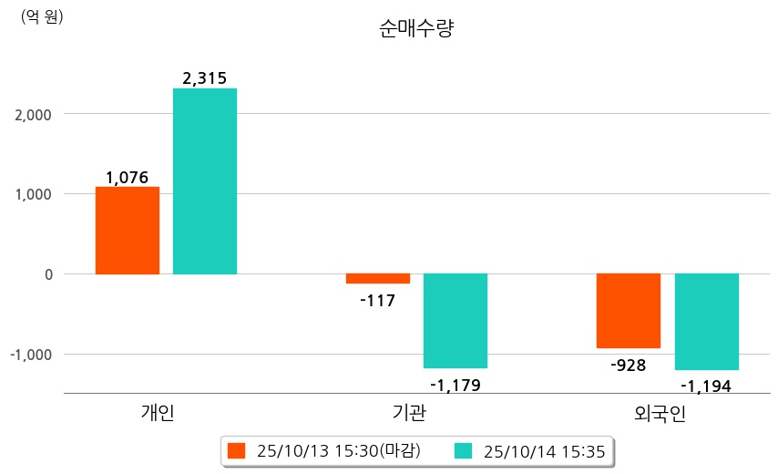 투자자별 동향을 살펴보면 기관은 1,179억 원 순매도했으며, 외국인은 1,194억 원 순매도했다. 개인은 2,315억 원 순매수했다.