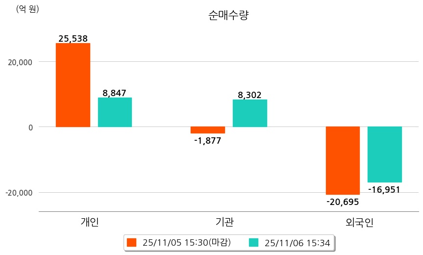투자자별 동향을 살펴보면 기관은 8,302억 원 순매수했으며, 외국인은 16,951억 원 순매도했다. 개인은 8,847억 원 순매수했다.
