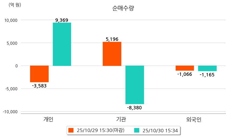 투자자별 동향을 살펴보면 기관은 8,380억 원 순매도했으며, 외국인은 1,165억 원 순매도했다. 개인은 9,369억 원 순매수했다.