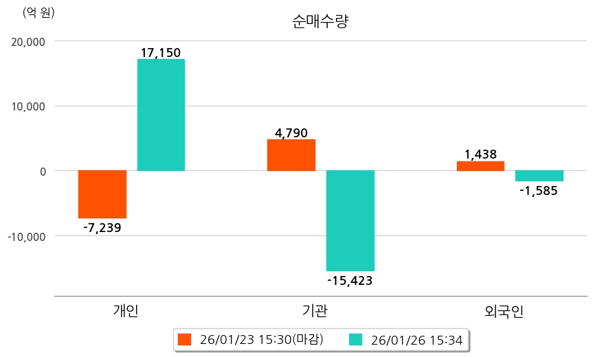 투자자별 동향을 살펴보면 기관은 15,423억 원 순매도했으며, 외국인은 1,585억 원 순매도했다. 개인은 17,150억 원 순매수했다.