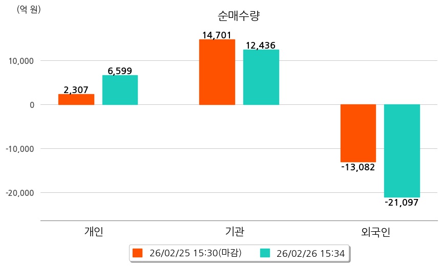 투자자별 동향을 살펴보면 기관은 12,436억 원 순매수했으며, 외국인은 21,097억 원 순매도했다. 개인은 6,599억 원 순매수했다.