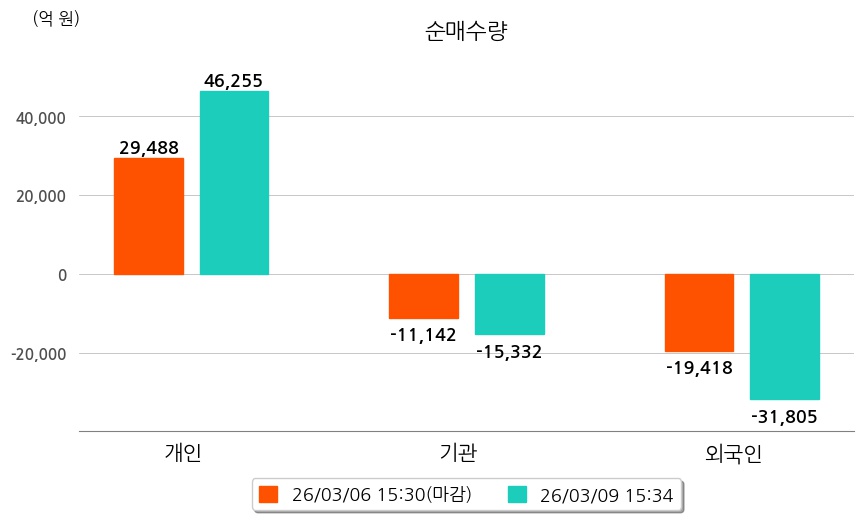 투자자별 동향을 살펴보면 기관은 15,332억 원 순매도했으며, 외국인은 31,805억 원 순매도했다. 개인은 46,255억 원 순매수했다.