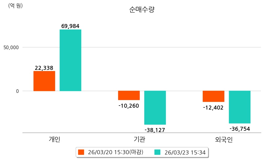 투자자별 동향을 살펴보면 기관은 38,127억 원 순매도했으며, 외국인은 36,754억 원 순매도했다. 개인은 69,984억 원 순매수했다.