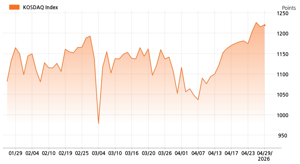 29일 오후 3시 코스닥(1,220.26p, 4.68p, +0.39%)는 개인 매수가 늘면서 상승세를 보이고 있다.
