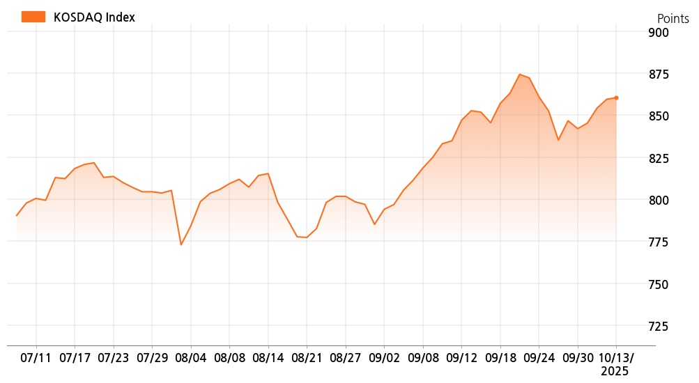 13일 오후 3시 코스닥(860.49p, 1.00p, +0.12%)는 개인 매수가 늘면서 상승세를 보이고 있다.