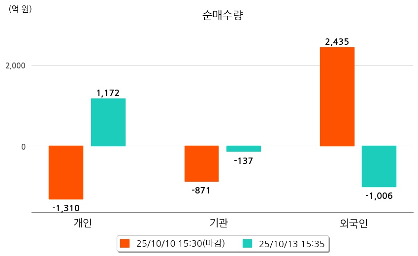 투자자별 동향을 살펴보면 기관은 137억 원 순매도했으며, 외국인은 1,006억 원 순매도했다. 개인은 1,172억 원 순매수했다.
