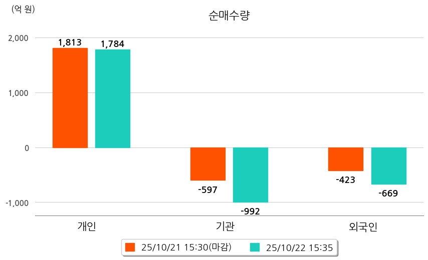 투자자별 동향을 살펴보면 기관은 992억 원 순매도했으며, 외국인은 669억 원 순매도했다. 개인은 1,784억 원 순매수했다.