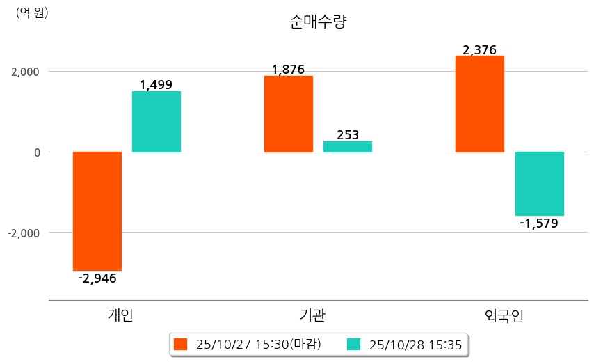 투자자별 동향을 살펴보면 기관은 253억 원 순매수했으며, 외국인은 1,579억 원 순매도했다. 개인은 1,499억 원 순매수했다.