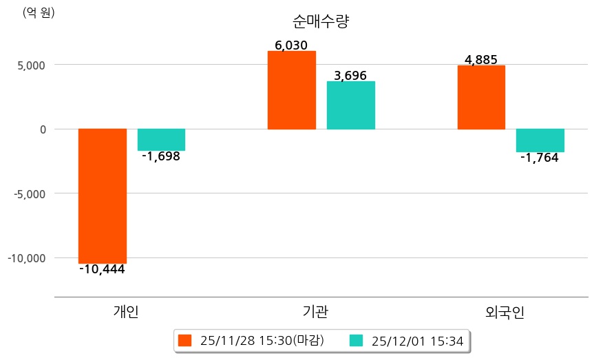 투자자별 동향을 살펴보면 기관은 3,696억 원 순매수했으며, 외국인은 1,764억 원 순매도했다. 개인은 1,698억 원 순매도했다.