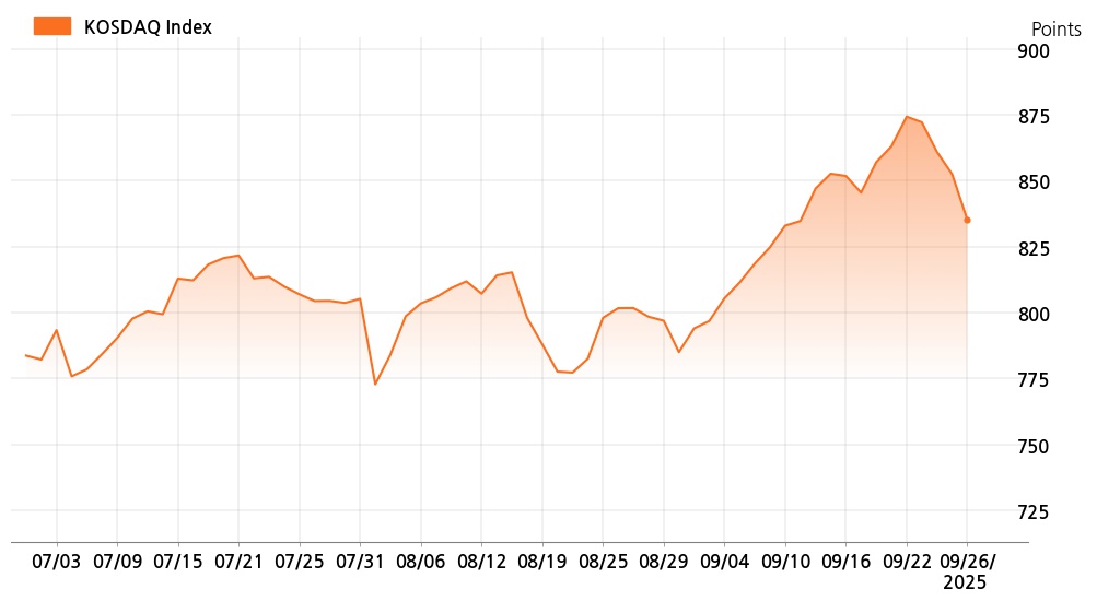 [마감 시황] 기관 매도 늘면서 코스닥 하락세(835p, -17.29p)