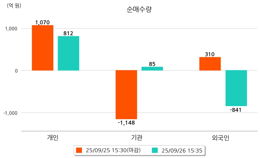 투자자별 동향을 살펴보면 기관은 85억 원 순매수했으며, 외국인은 841억 원 순매도했다. 개인은 812억 원 순매수했다.
