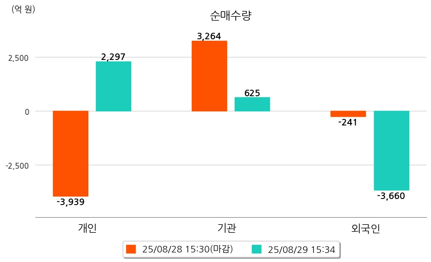 투자자별 동향을 살펴보면 기관은 625억 원 순매수했으며, 외국인은 3,660억 원 순매도했다. 개인은 2,297억 원 순매수했다.