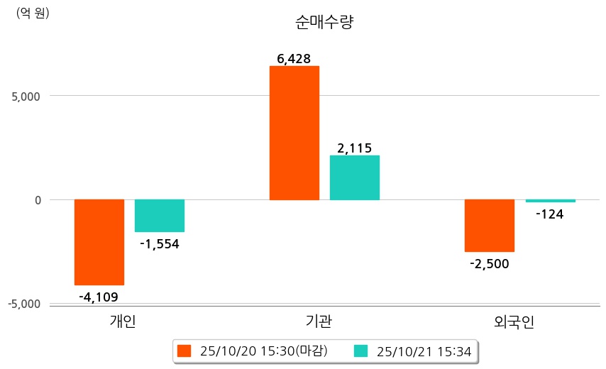 투자자별 동향을 살펴보면 기관은 2,115억 원 순매수했으며, 외국인은 124억 원 순매도했다. 개인은 1,554억 원 순매도했다.