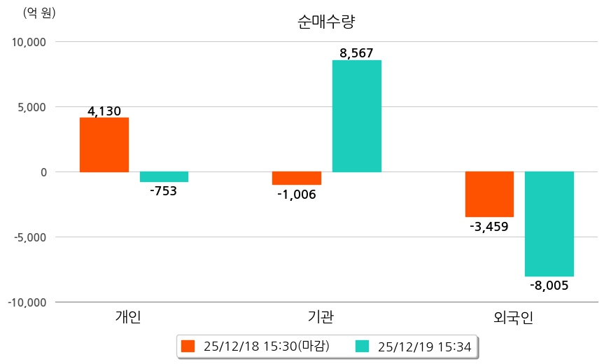 투자자별 동향을 살펴보면 기관은 8,567억 원 순매수했으며, 외국인은 8,005억 원 순매도했다. 개인은 753억 원 순매도했다.