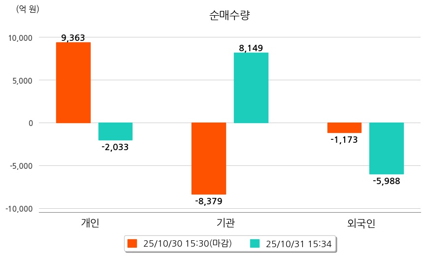 투자자별 동향을 살펴보면 기관은 8,149억 원 순매수했으며, 외국인은 5,988억 원 순매도했다. 개인은 2,033억 원 순매도했다.