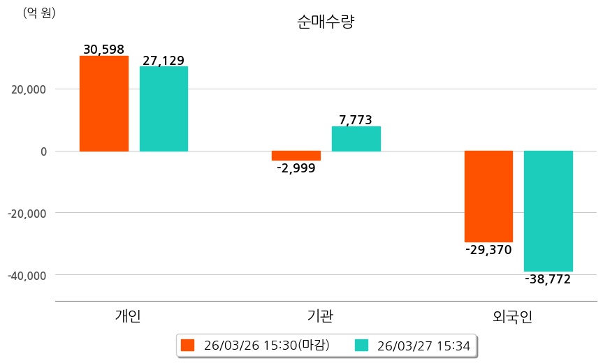 투자자별 동향을 살펴보면 기관은 7,773억 원 순매수했으며, 외국인은 38,772억 원 순매도했다. 개인은 27,129억 원 순매수했다.
