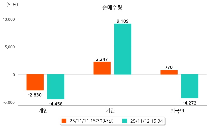 투자자별 동향을 살펴보면 기관은 9,109억 원 순매수했으며, 외국인은 4,272억 원 순매도했다. 개인은 4,458억 원 순매도했다.