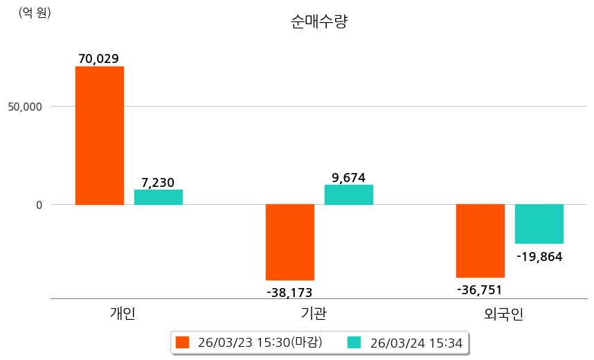 투자자별 동향을 살펴보면 기관은 9,674억 원 순매수했으며, 외국인은 19,864억 원 순매도했다. 개인은 7,230억 원 순매수했다.