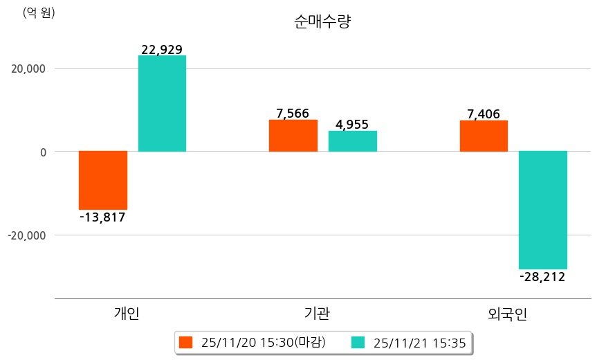 투자자별 동향을 살펴보면 기관은 4,955억 원 순매수했으며, 외국인은 28,212억 원 순매도했다. 개인은 22,929억 원 순매수했다.