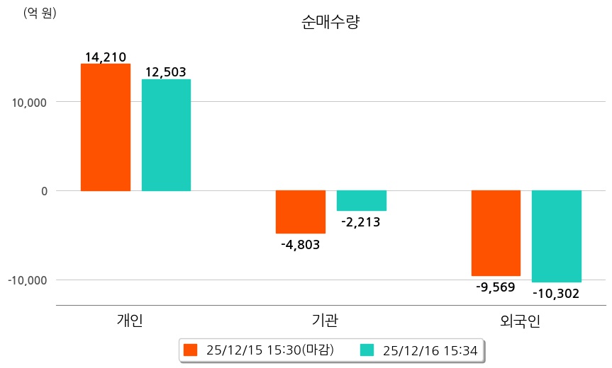 투자자별 동향을 살펴보면 기관은 2,213억 원 순매도했으며, 외국인은 10,302억 원 순매도했다. 개인은 12,503억 원 순매수했다.