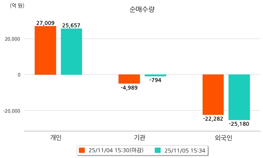 투자자별 동향을 살펴보면 기관은 794억 원 순매도했으며, 외국인은 25,180억 원 순매도했다. 개인은 25,657억 원 순매수했다.