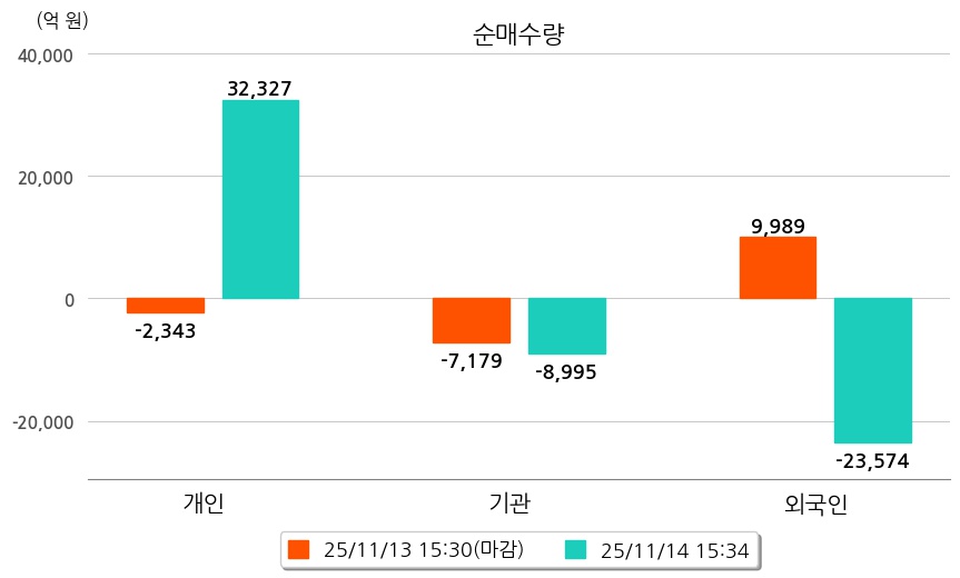 투자자별 동향을 살펴보면 기관은 8,995억 원 순매도했으며, 외국인은 23,574억 원 순매도했다. 개인은 32,327억 원 순매수했다.